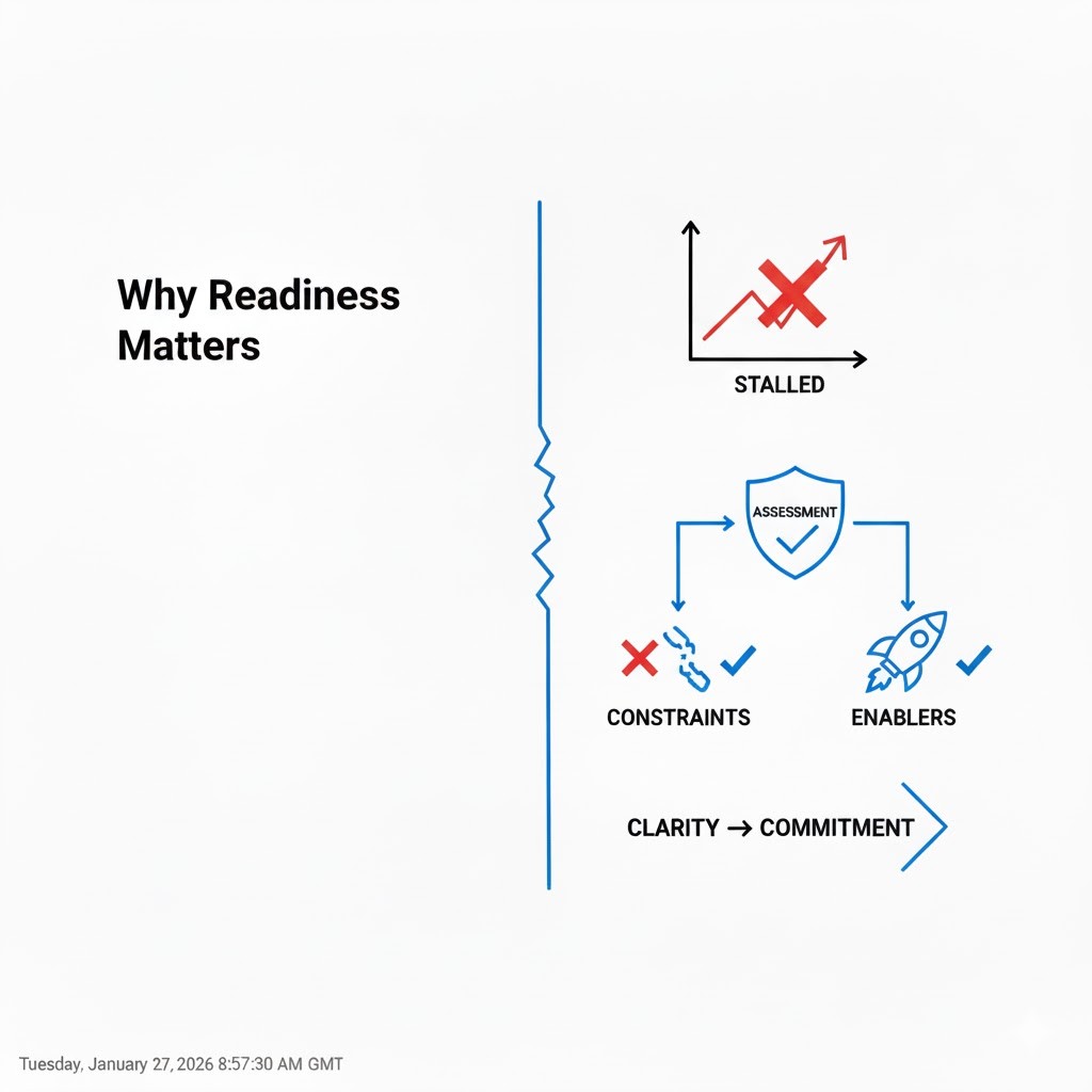A readiness assessment prevents wasted investment. It identifies constraints that will block progress and enablers that will accelerate it.